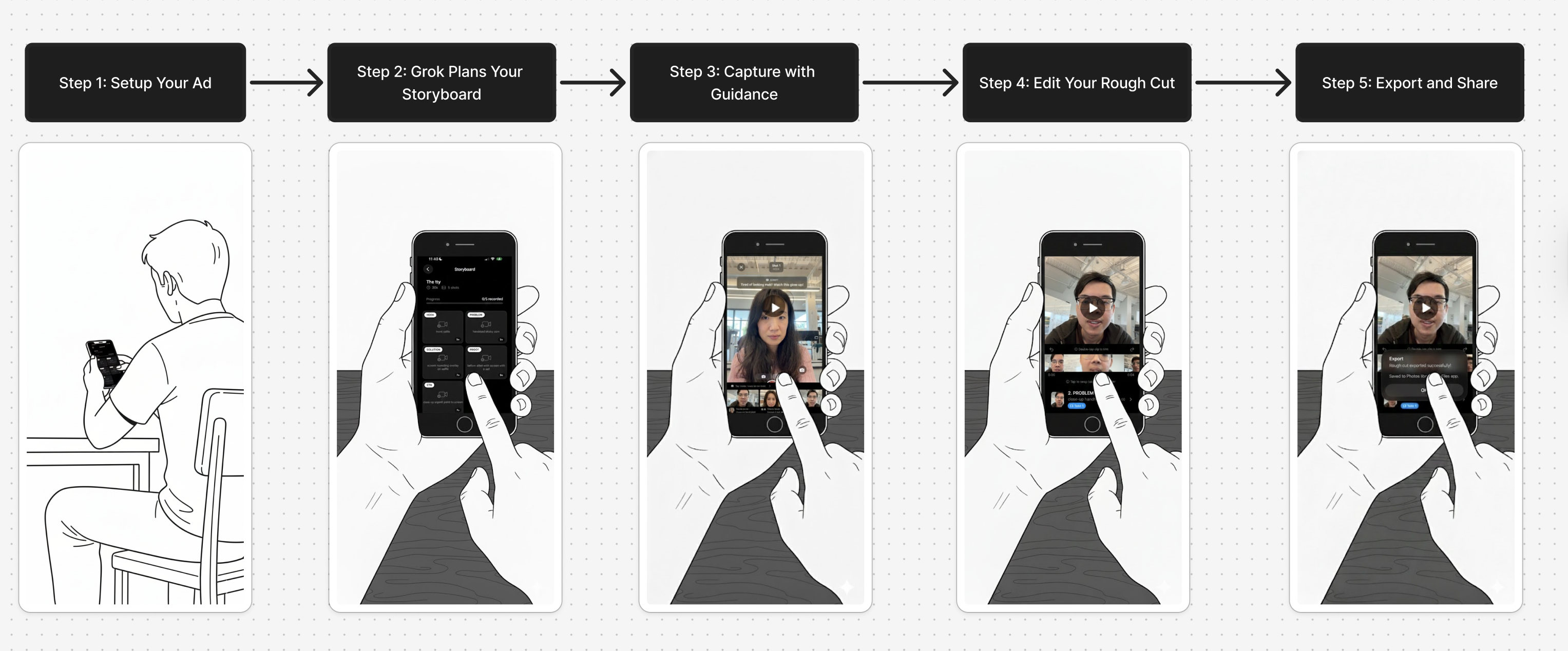I designed and built a unified iOS pipeline integrating Grok 4.1 Fast, Grok Voice, and the X API into a single continuous flow — from photo input to exported video. The core UX innovation was a synchronized shot-overlay + teleprompter system: as the script plays, dynamic framing guides tell the user exactly where to position the camera and how to deliver each line. Complex directorial decisions become intuitive visual feedback, removing the need for any filmmaking expertise.