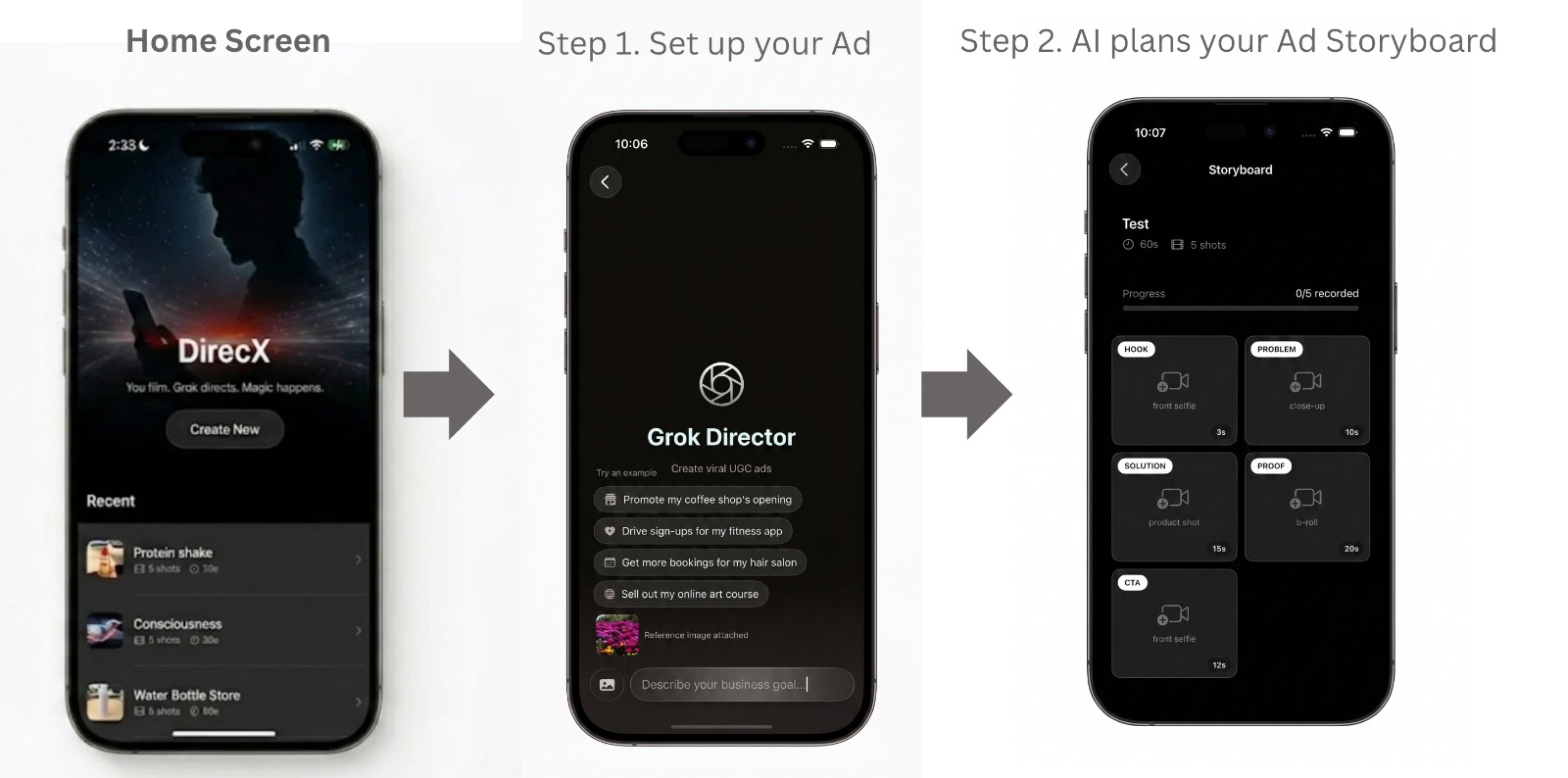 DirecX is an AI-powered iOS filmmaking app built in 24 hours at the xAI Hackathon in San Francisco. Our team — a CS × Film double major, an animation artist, and a design engineer — united around a shared frustration: professional video production is gated behind expensive tools, fragmented workflows, and steep learning curves.