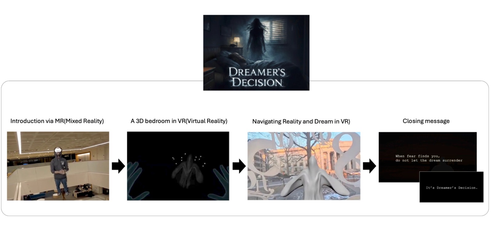 A Dreamer's Decision is an interactive VR experience that reframes the terrifying phenomena of sleep paralysis into a safe, responsive dialogue. By merging stereoscopic video, spatial computing, and conversational AI, we created a deeply immersive psychological journey.