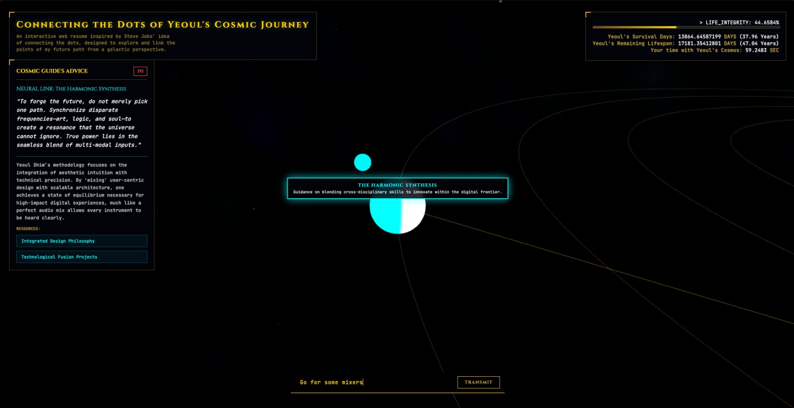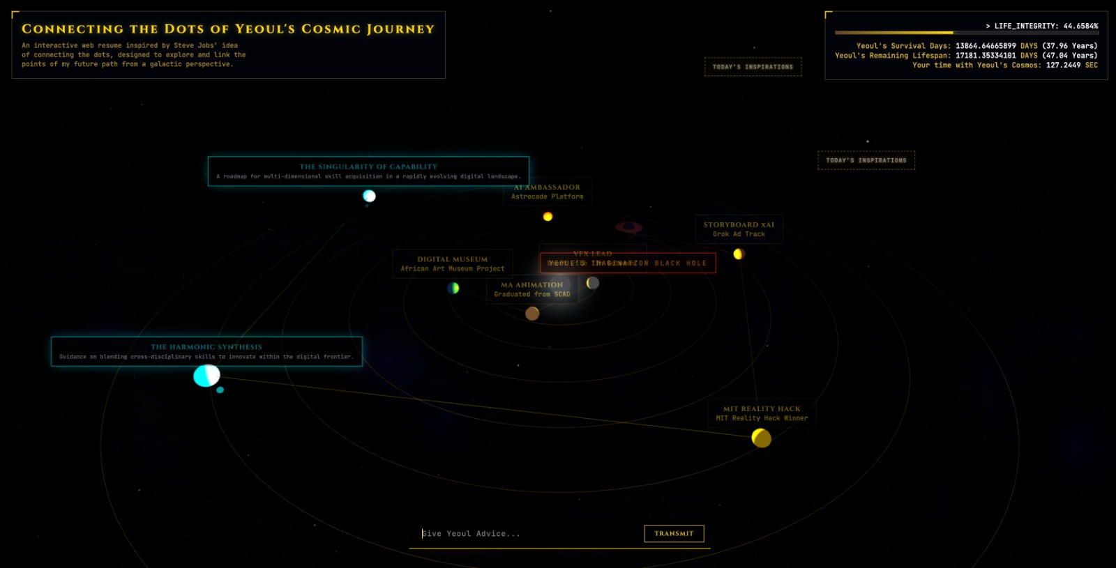 🚀 Explore my interactive web resume! Inspired by Steve Jobs' idea of connecting the dots, I visualized my journey as planets—each a dot from my past. Website visitor input and AI suggestions generate new coordinates, letting you help shape my future path.