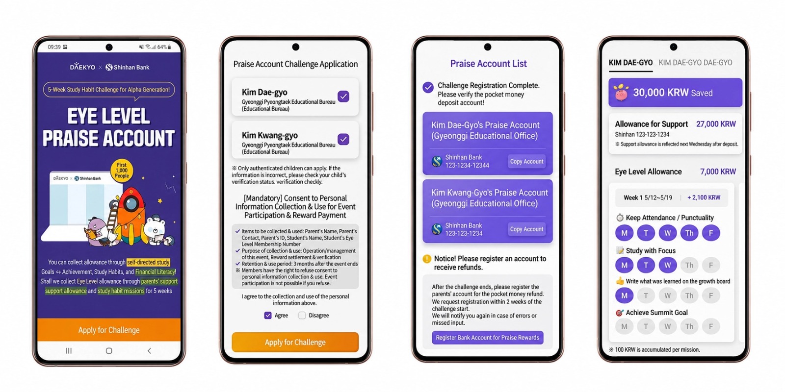 Open original article (English) ↗Shinhan Bank and Daekyo run the 'Eye Level Praise Account 5-Week Challenge' to build study habits and financial literacy for 1,000+ Noonopi students.