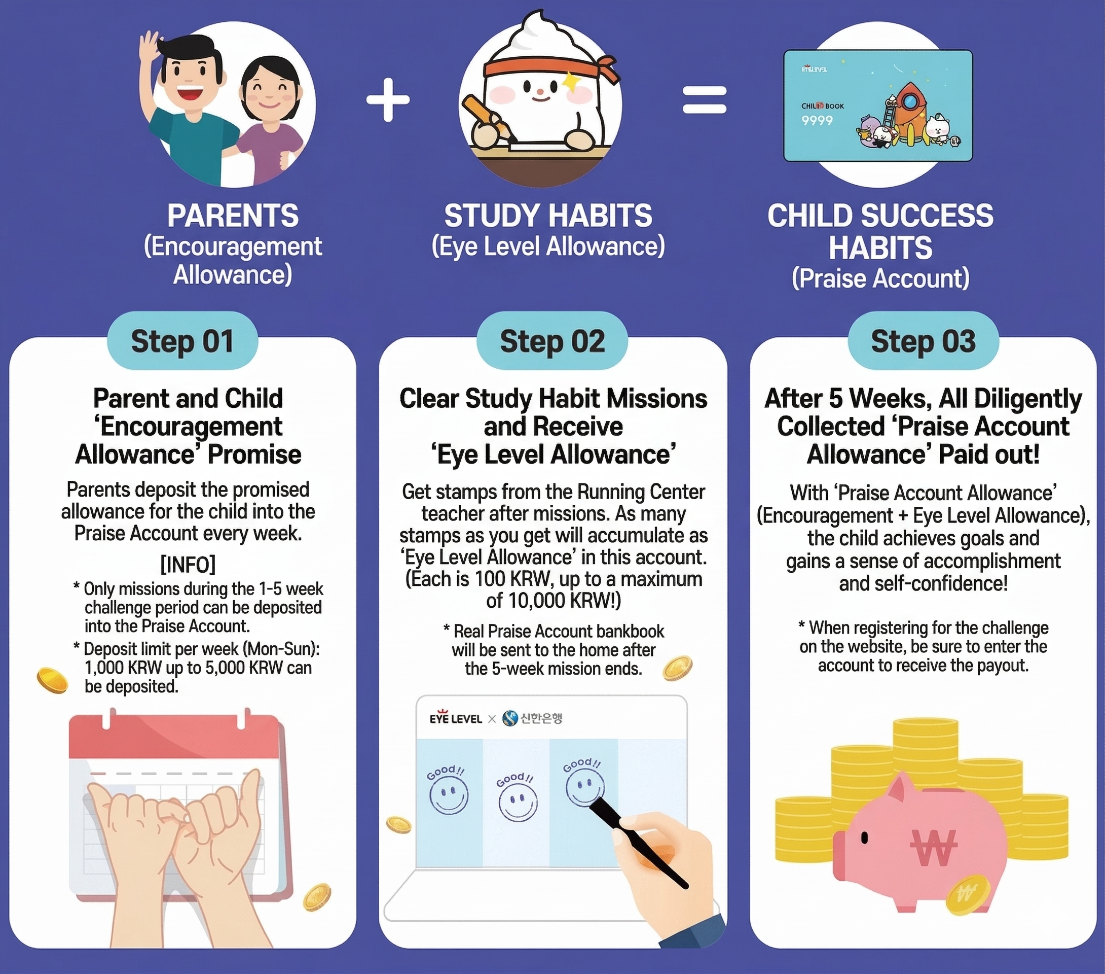 I designed the complete UI system from scratch for the Eye Level Praise Account — including a weekly mission dashboard, a physical-digital co-branded passbook (Daekyo × Shinhan Bank), and a virtual account ledger. Daily study missions at the learning center earn up to 4 stamps per day (100 KRW each), with parent deposits and mission rewards tracked in real-time online. At the end of 5 weeks, total accumulated savings are paid out in full. The component library features rounded, friendly geometry and a high-contrast palette built for young users, with a Shinhan Bank financial literacy module — delivered via 2 YouTube sessions — integrated into the broader experience.