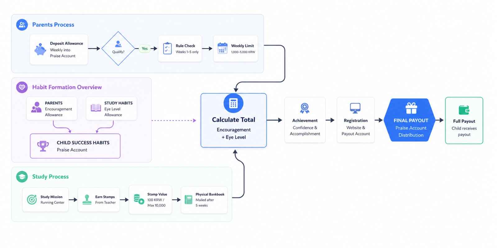 My strategy centered on a 'Dual-Interface Architecture' built around a unified design system. I mapped two distinct mental models: a high-feedback, stamp-driven interface for children and a data-driven oversight dashboard for parents. The 5-week challenge structure — combining a parent-funded Cheering Allowance (up to 5,000 KRW/week) and a mission-earned Eye Level Allowance (up to 10,000 KRW total) — became the core interaction loop I designed around. Gamification metaphors like stamps, progress trackers, and virtual savings jars were used to lower the cognitive barrier to financial concepts.